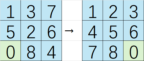 九宫格放\(1\sim 8\)八个数,一个空格可以看作\(0\),\(0\)周围的格子可以移到\(0\)上,找一个移动方案将\(1\sim 8\)归位到从上到下、从左到右按顺序的排列。